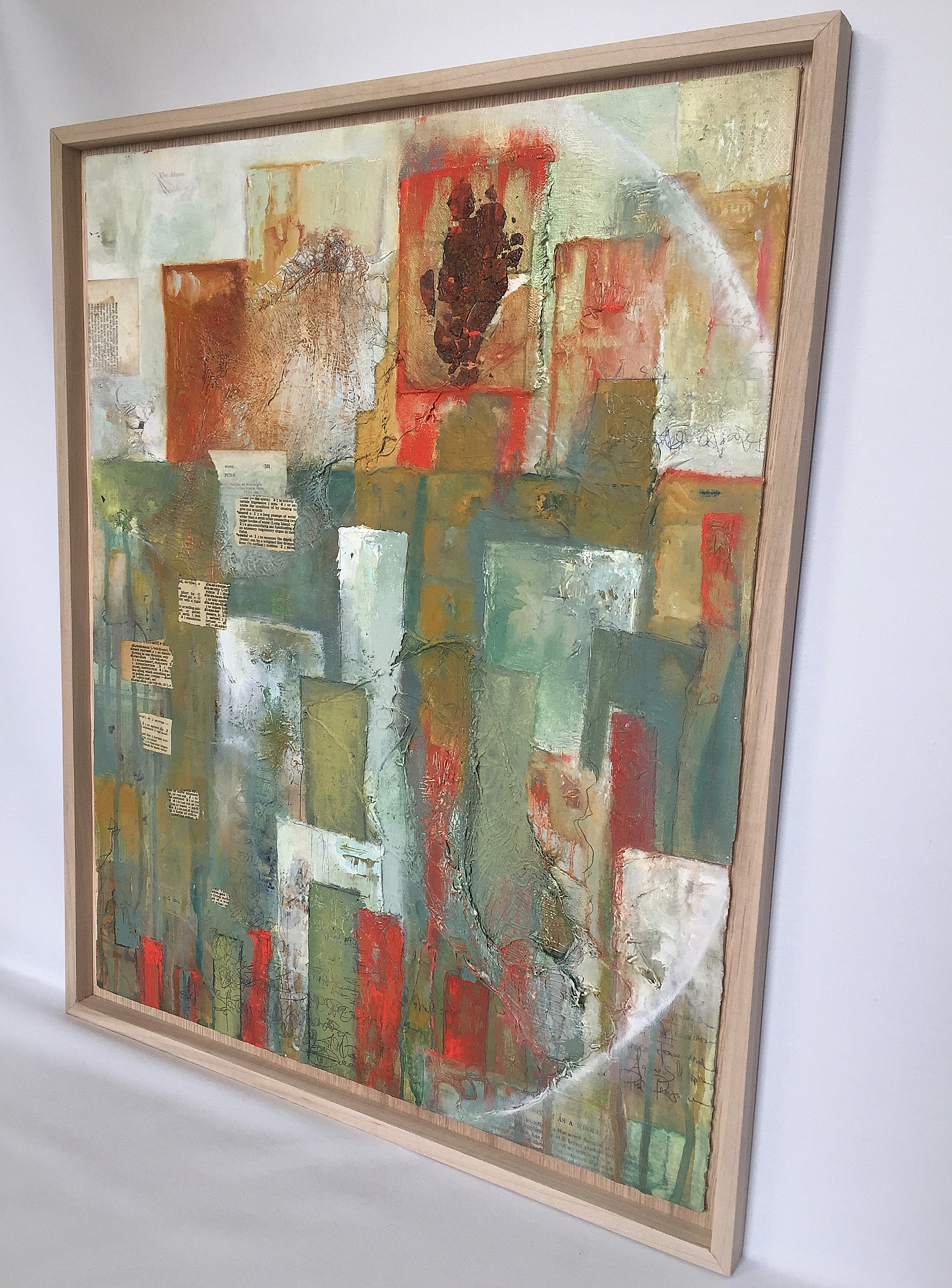 paper colllage, graphite, gauze, found things, and oil on canvas 21” x 17.5”